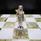 Поле шахмат выполнено из редкого и благородного оникса, сочетающего в себе оттенки белого и глубокого зеленого. Доска и фигуры, отлитые из бронзы, вручную расписаны серебром и золотом, придавая им неповторимый блеск и роскошь. Каждый элемент выполнен с исключительным вниманием к деталям, что делает эти шахматы настоящим шедевром.